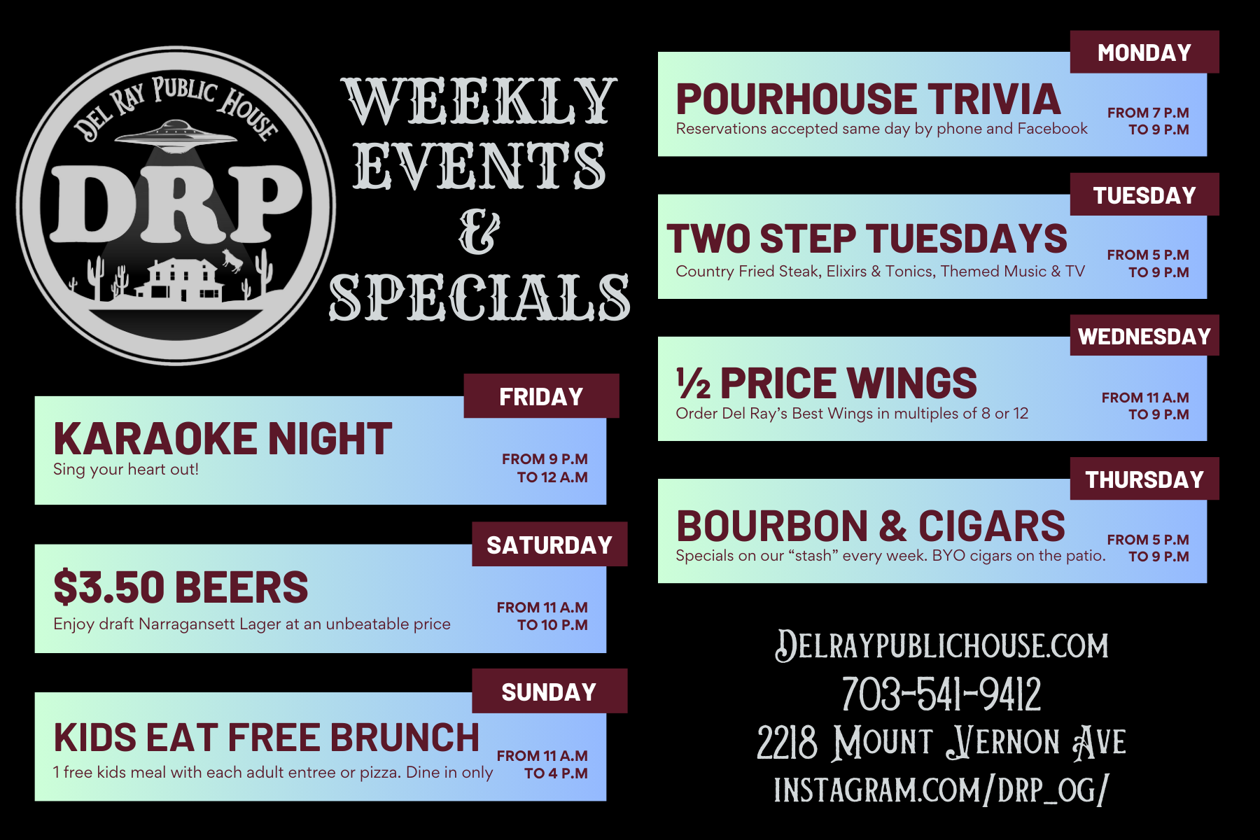 Our new menu and atmosphere is inspired by both the high-desert landscapes (and high-strangeness) of the American Southwest and the timeless charm of a classic Public House. Whether you're joining us for a themed trivia, family pizza night, or a steak dinner for two, DRP is where the community gathers. We invite you to pull up a chair, grab a pour, and enjoy the next chapter of Del Ray history with us.